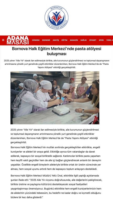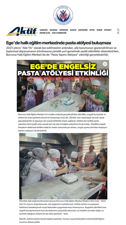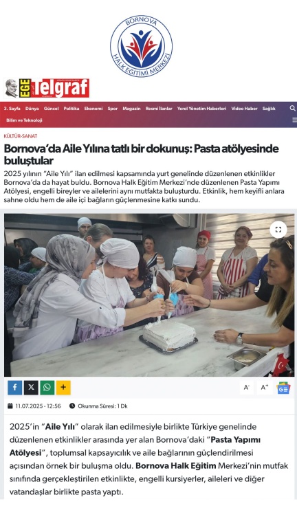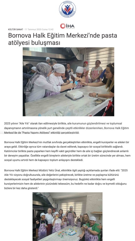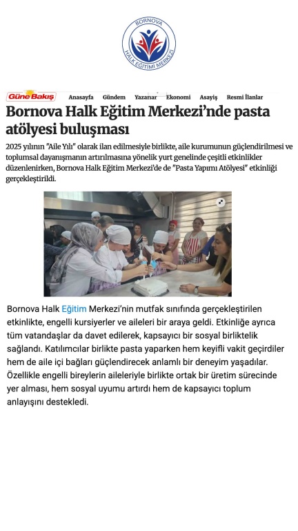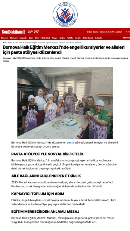 Bornova Halk Eğitim Merkezi'nin mutfak sınıfında gerçekleşen etkinlikte katılımcılar bir- likte pasta yaparak keyifli vakit geçirdi. Engelli kursiyerler ve aileleri, üretim sürecine dahil olarak toplumsal dayanışmaya katkı sağladı.